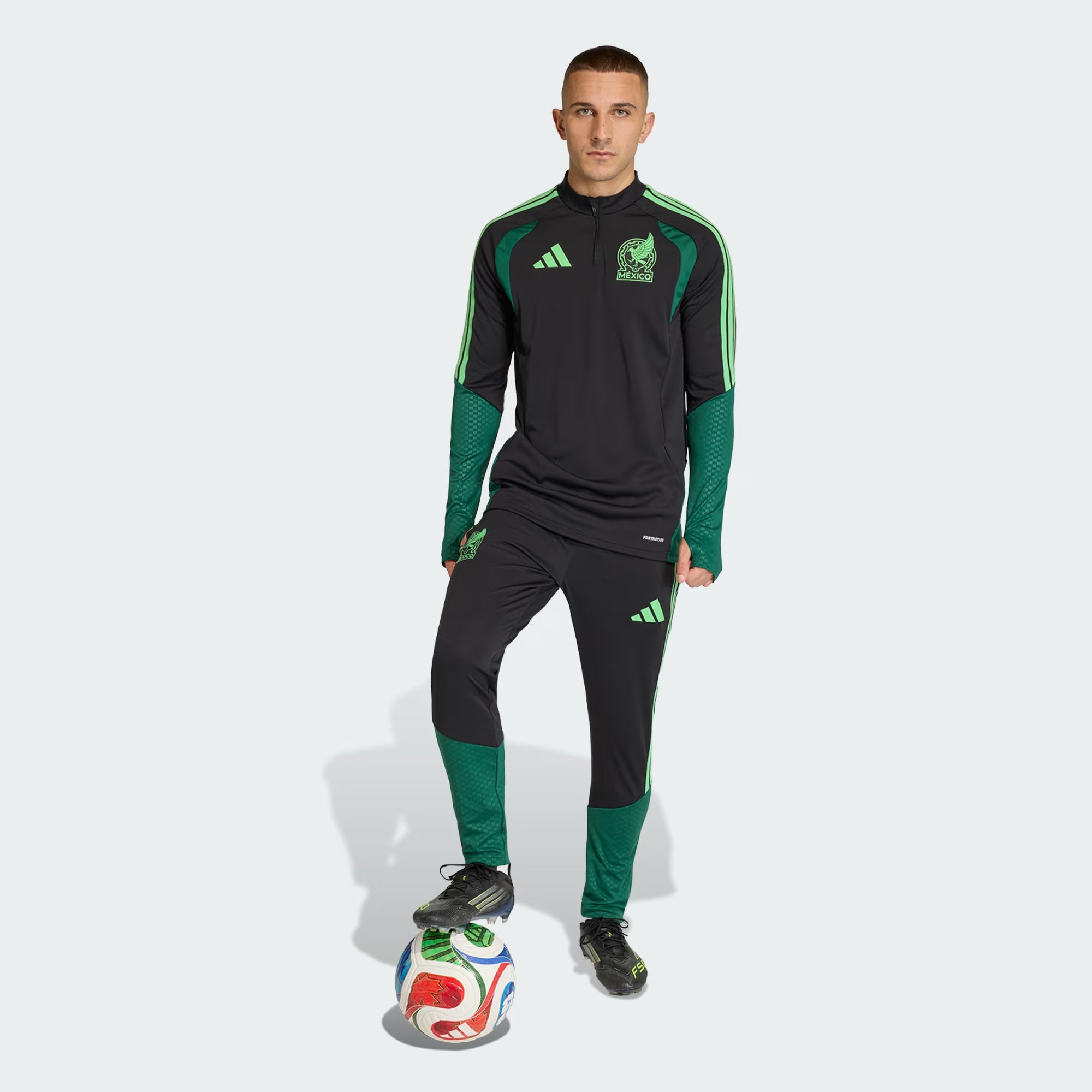 Step out onto the pitch in the Mexico 26 Tiro Training Top, where tradition meets innovation. Inspired by the iconic home kit, this top connects you to the rich heritage of the federation, adding a fresh twist. Made for performance, it features mechanical stretch fabrics that prioritize fit and comfort. Integrated Formotion technology is designed to free your movement, not restrict it, allowing you to control, pass, and shoot with confidence. The embossed design elements bring a touch of style to your training gear, while mesh chest inserts offer ventilation, helping you feel focused as you push your limits. The sleek zipper opening adds wearability, making it a practical choice for athletes. Whether you're perfecting your skills or engaging in rigorous drills, this training top supports your moves. Embrace the spirit of Mexico and raise your game with adidas.