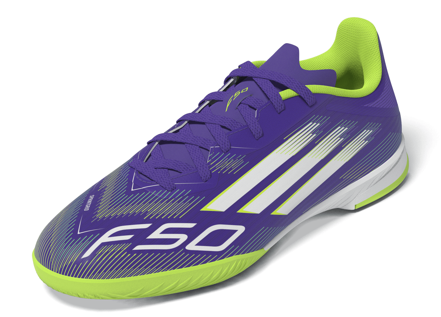 Find your fast to truly express yourself on the court. Feel the rush in adidas F50 boots engineered for speed. Standing out with an eye-catching Sprintgrid print, the Fiberskin upper on these juniors' League football boots employs a perforated tongue for cool play. That non-marking rubber outsole lays down serious pace on indoor surfaces.