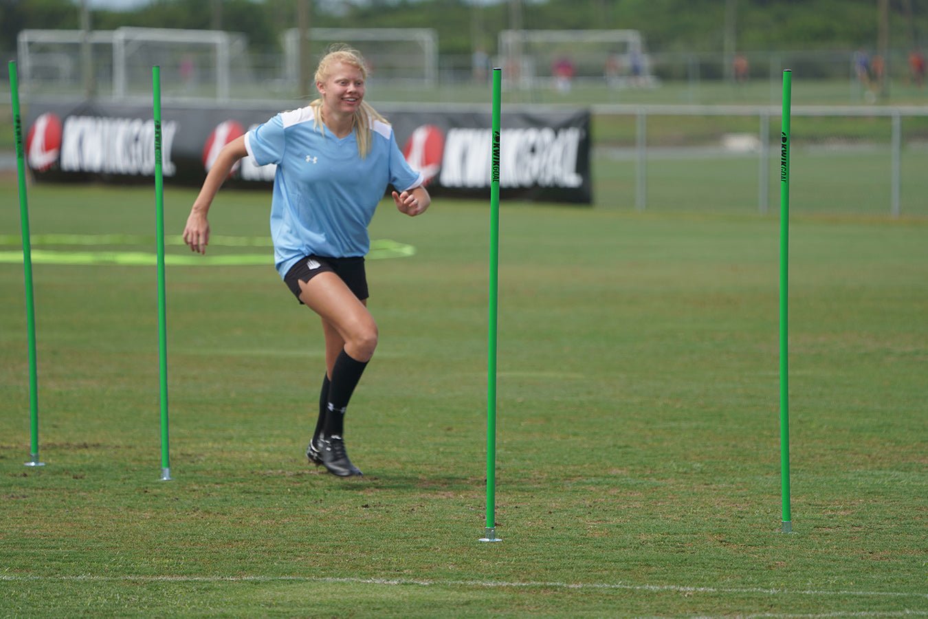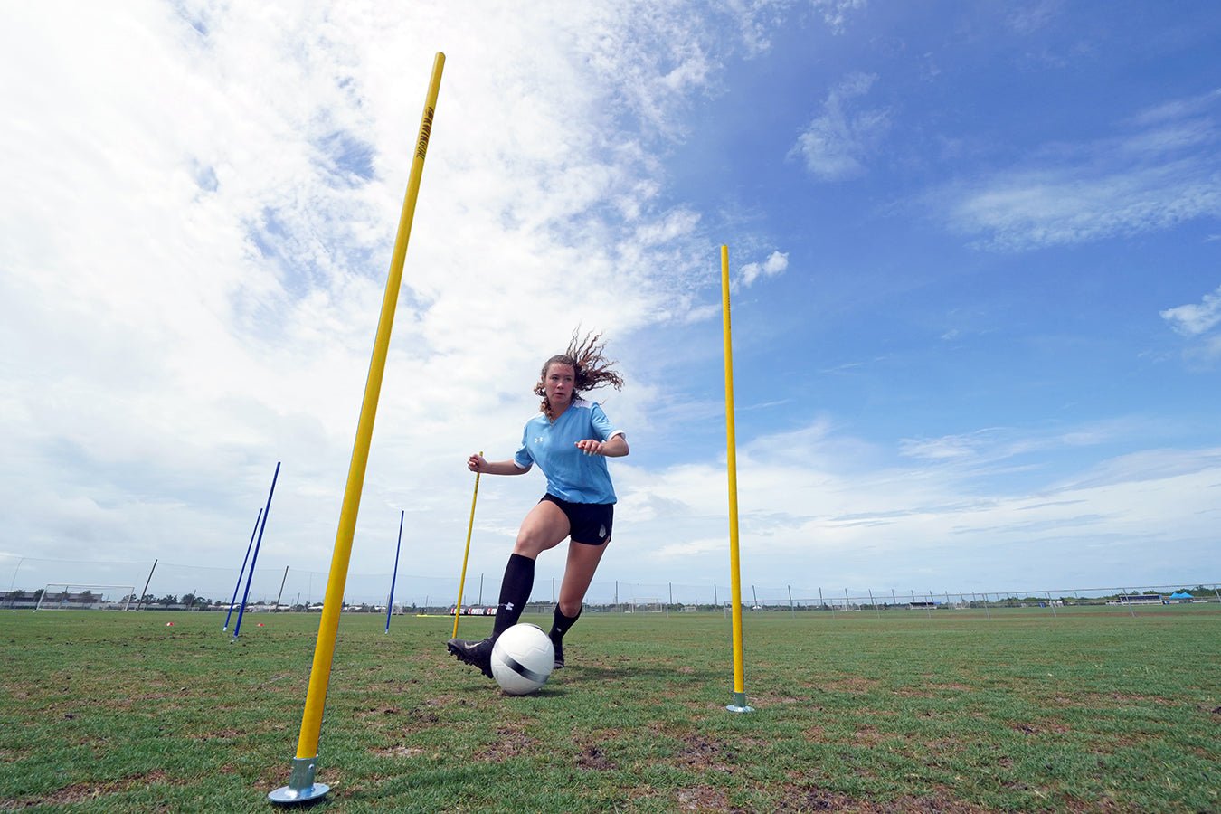 Los palos de entrenamiento de Kwik Goal están diseñados para ayudar a mejorar la velocidad de los pies, las habilidades básicas de control del balón, el tiempo de reacción y la agilidad general de los jugadores. Estos palos se fijan al suelo utilizando una clavija para superficies naturales y se pueden colocar de diversas formas según los ejercicios de entrenamiento específicos. Los palos de entrenamiento 16B10 incluyen un juego de 6 palos de entrenamiento y están disponibles en 5 colores, entre ellos: amarillo, rojo, azul, naranja de alta visibilidad y verde de alta visibilidad.