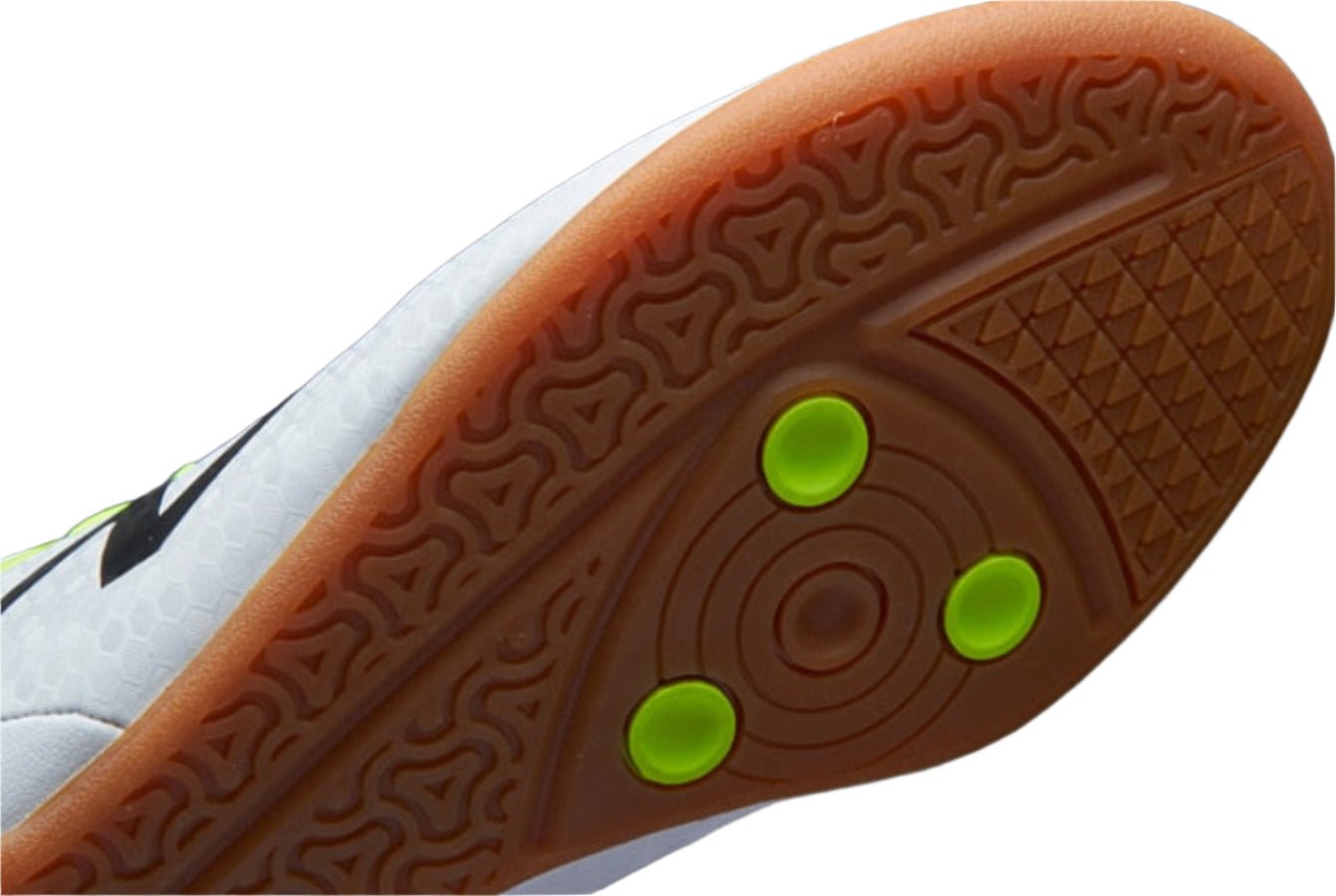 The New Balance Visaro Control IN Indoor Soccer Shoes in White/Tonix feature a soft PU synthetic upper with textured zones for enhanced touch and control. Asymmetric lacing expands the sweet spot for precise ball handling, while the internal stiffened heel protects the Achilles. A fixed EVA sockliner ensures cushioned comfort, and the lightweight, non-marking gum rubber outsole provides reliable traction on indoor surfaces. Designed for players developing their skills, these boots offer a perfect balance of control and comfort for the indoor game.